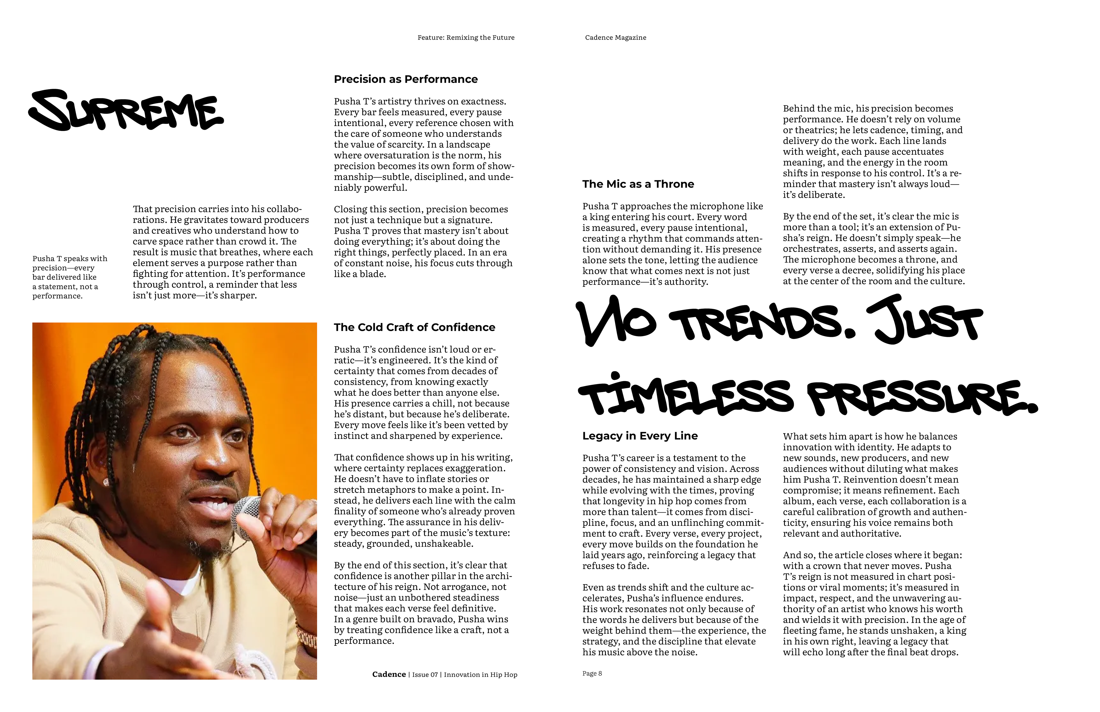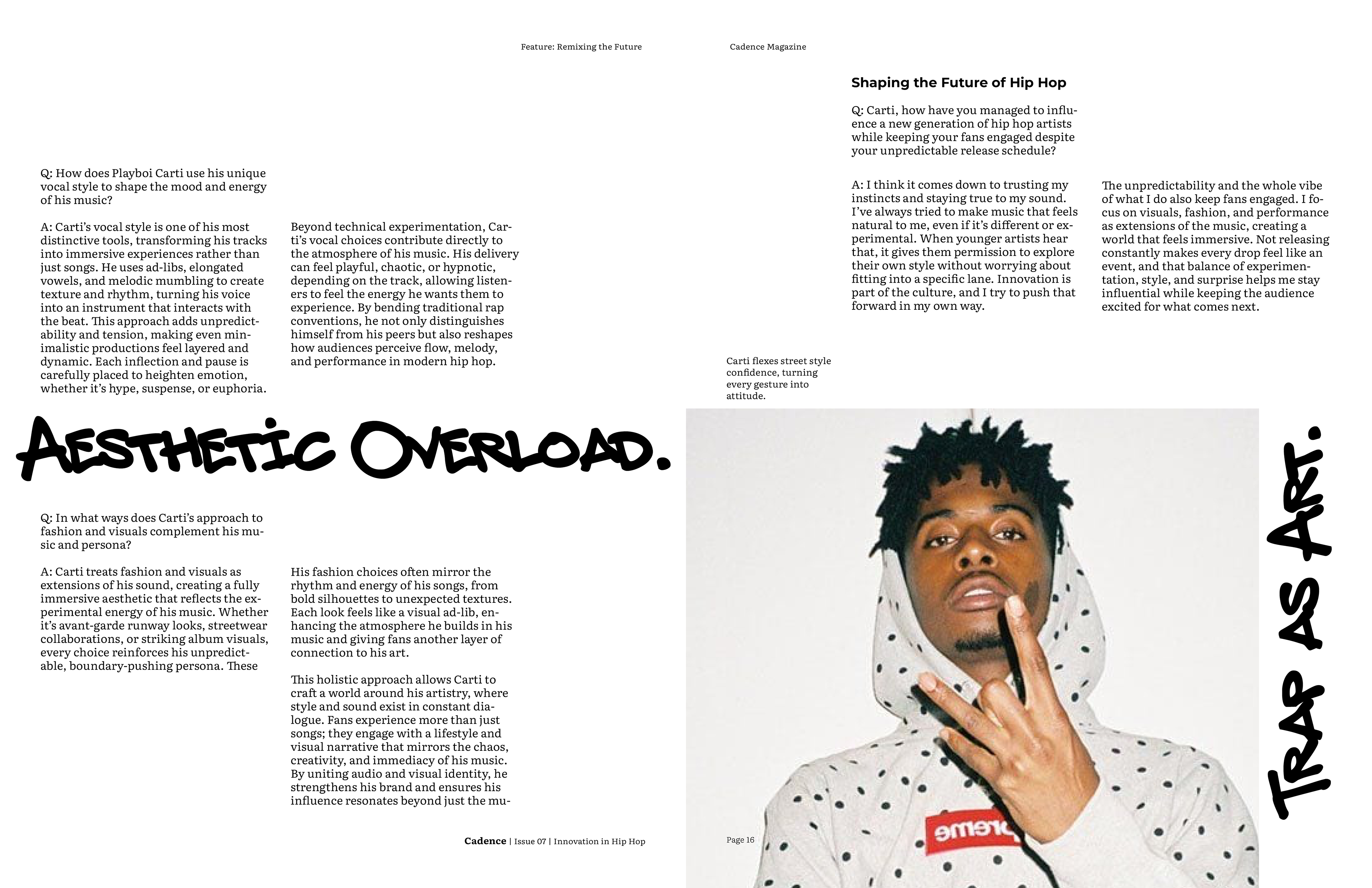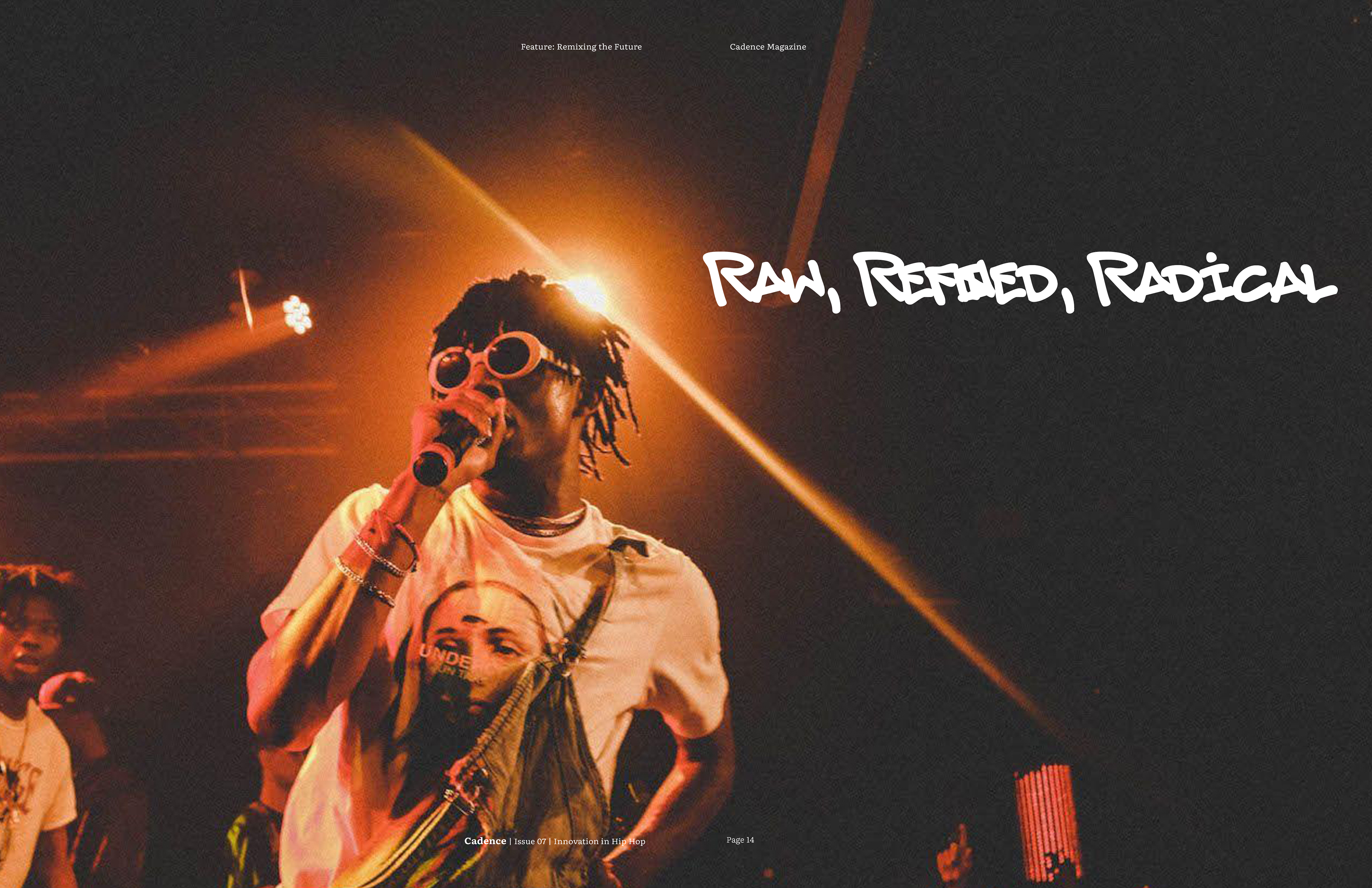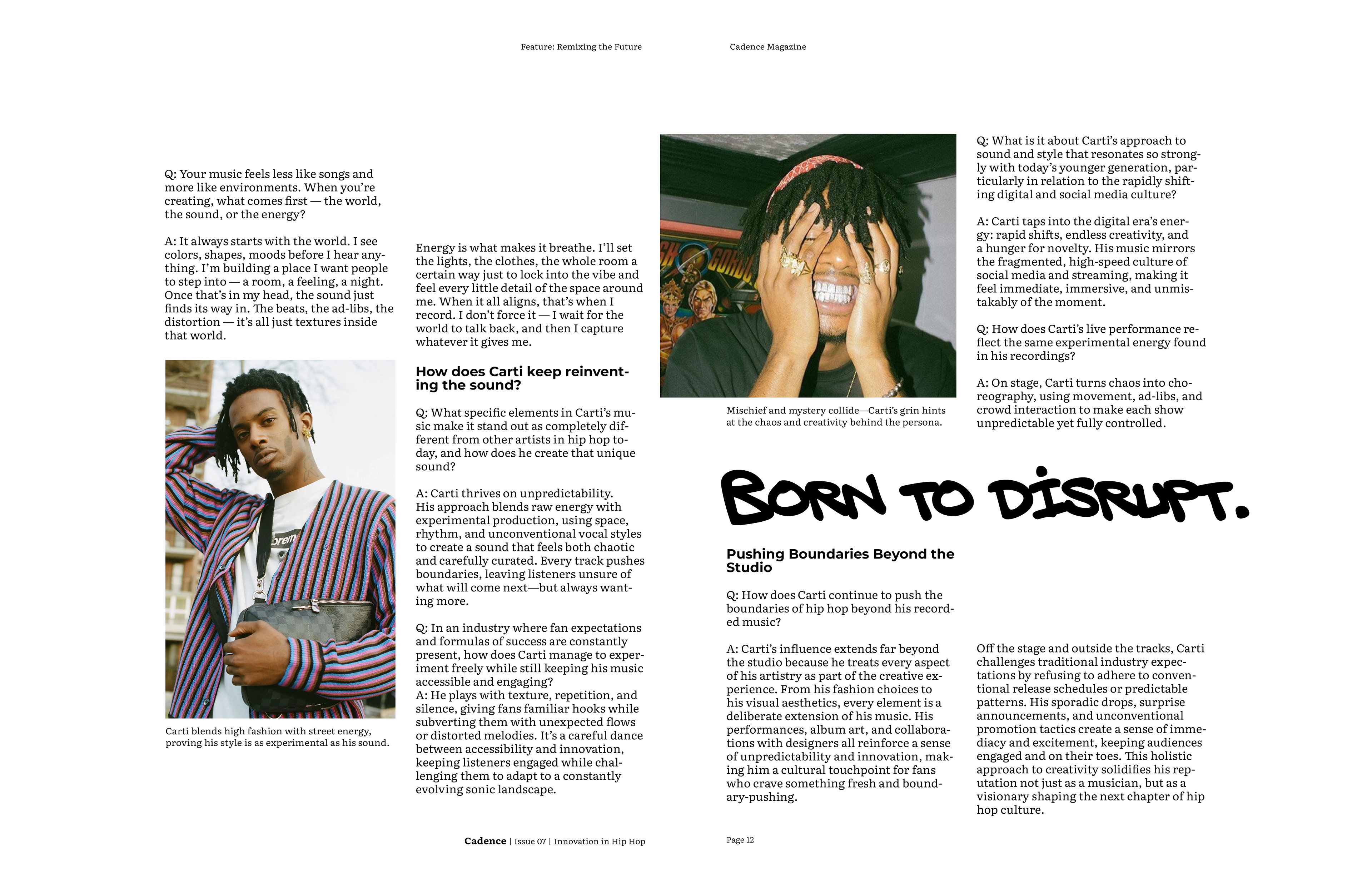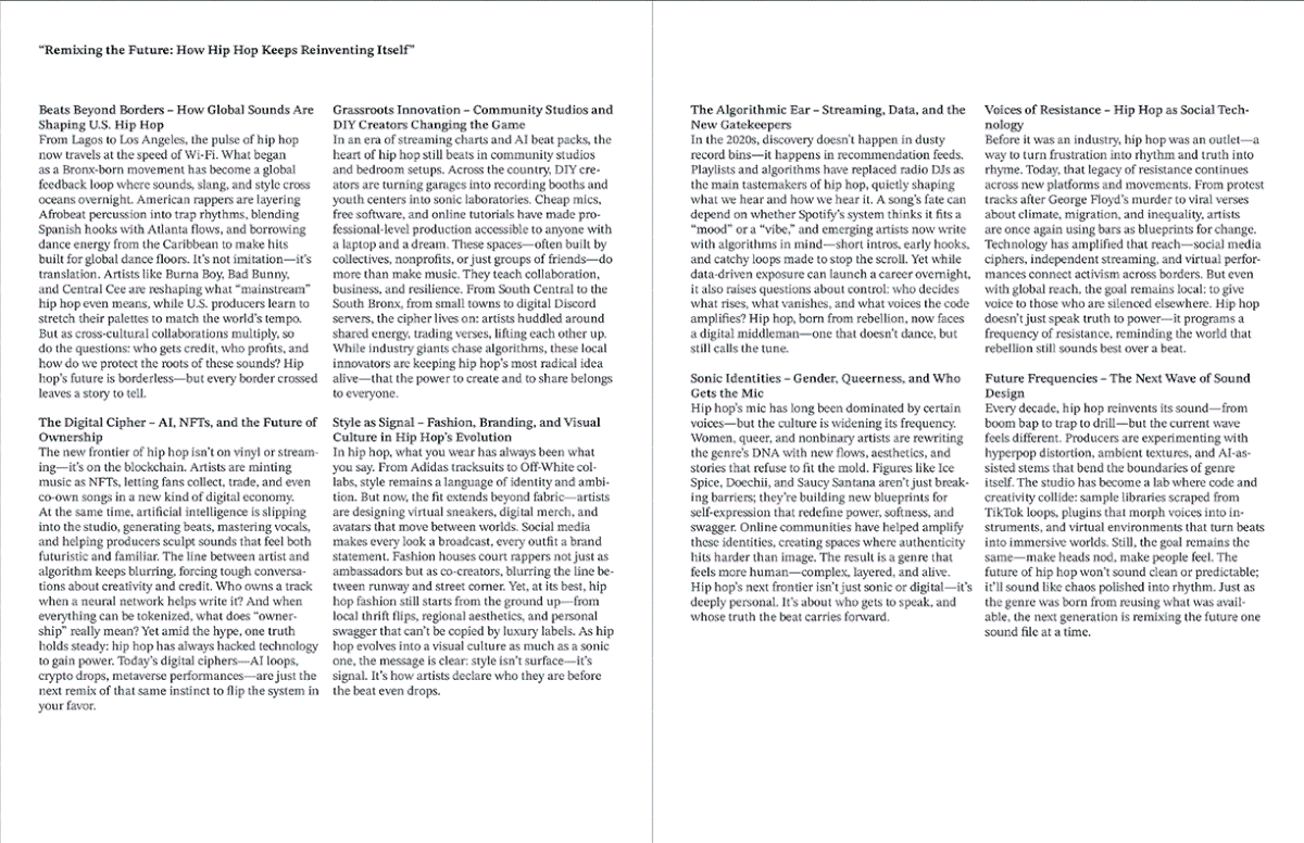 For the final magazine I decided to incorporate bold graffiti callouts, with the typeface choice inspired by the idea of ad-libs in hip hop. I used a 5 column grid system to replicate the open endedness in rap. The articles all start with a black and white image, however from there color may be incorporated, depending on what is necessary to convey the artist properly. I chose Literata as the typeface for body copy, since it is very legible, and Montserrat as a bold contrast for subheadings and decks.