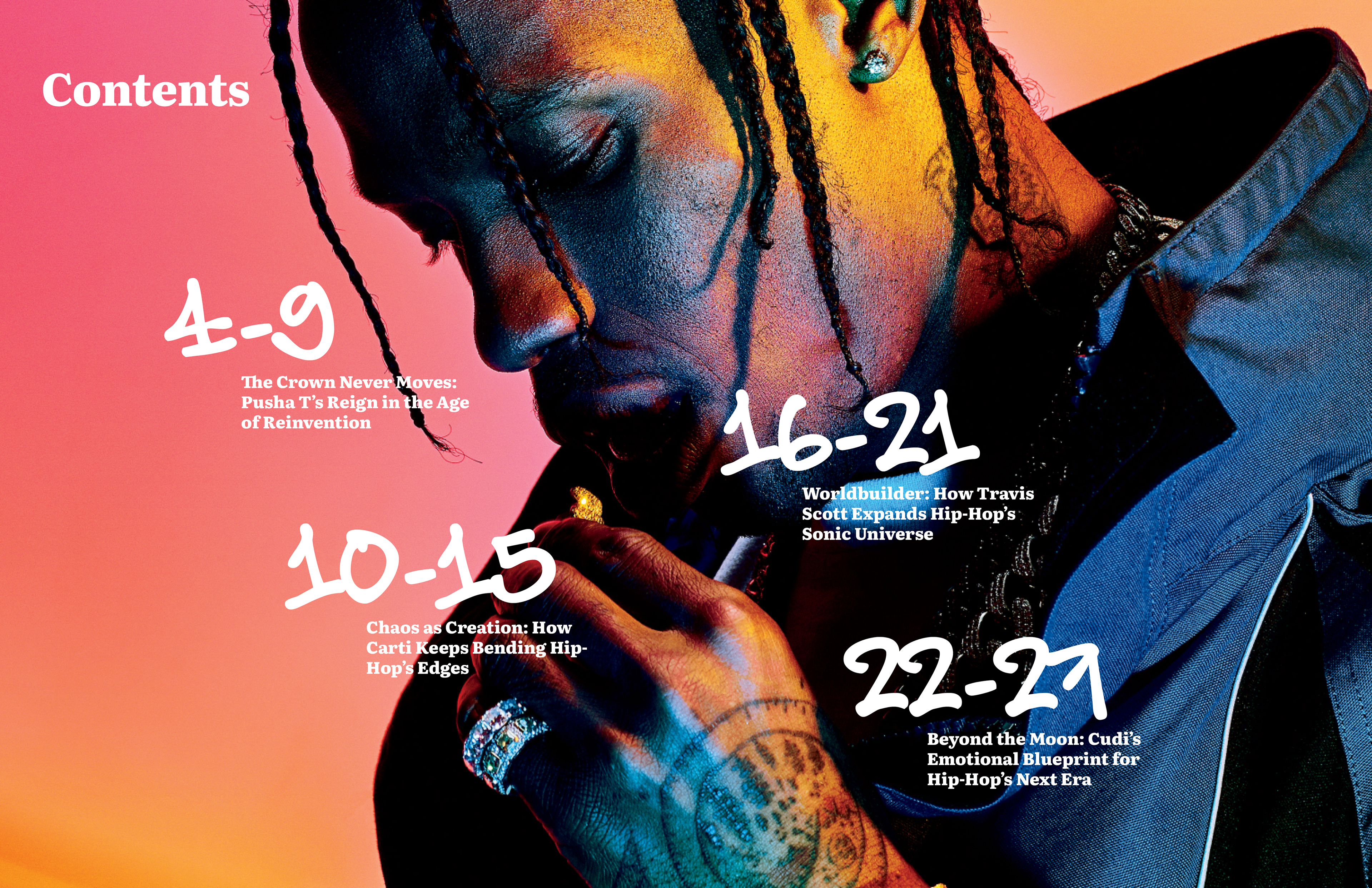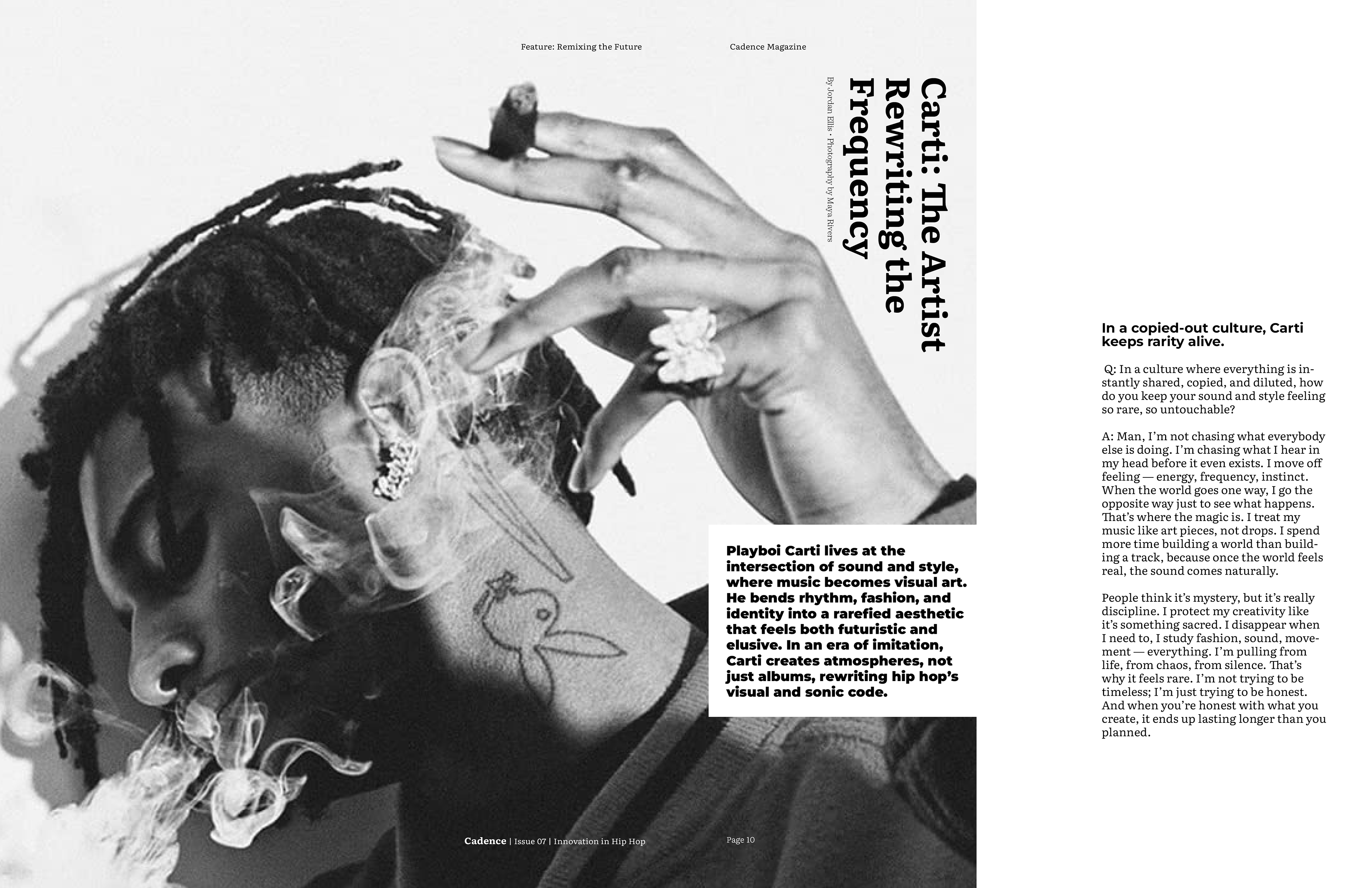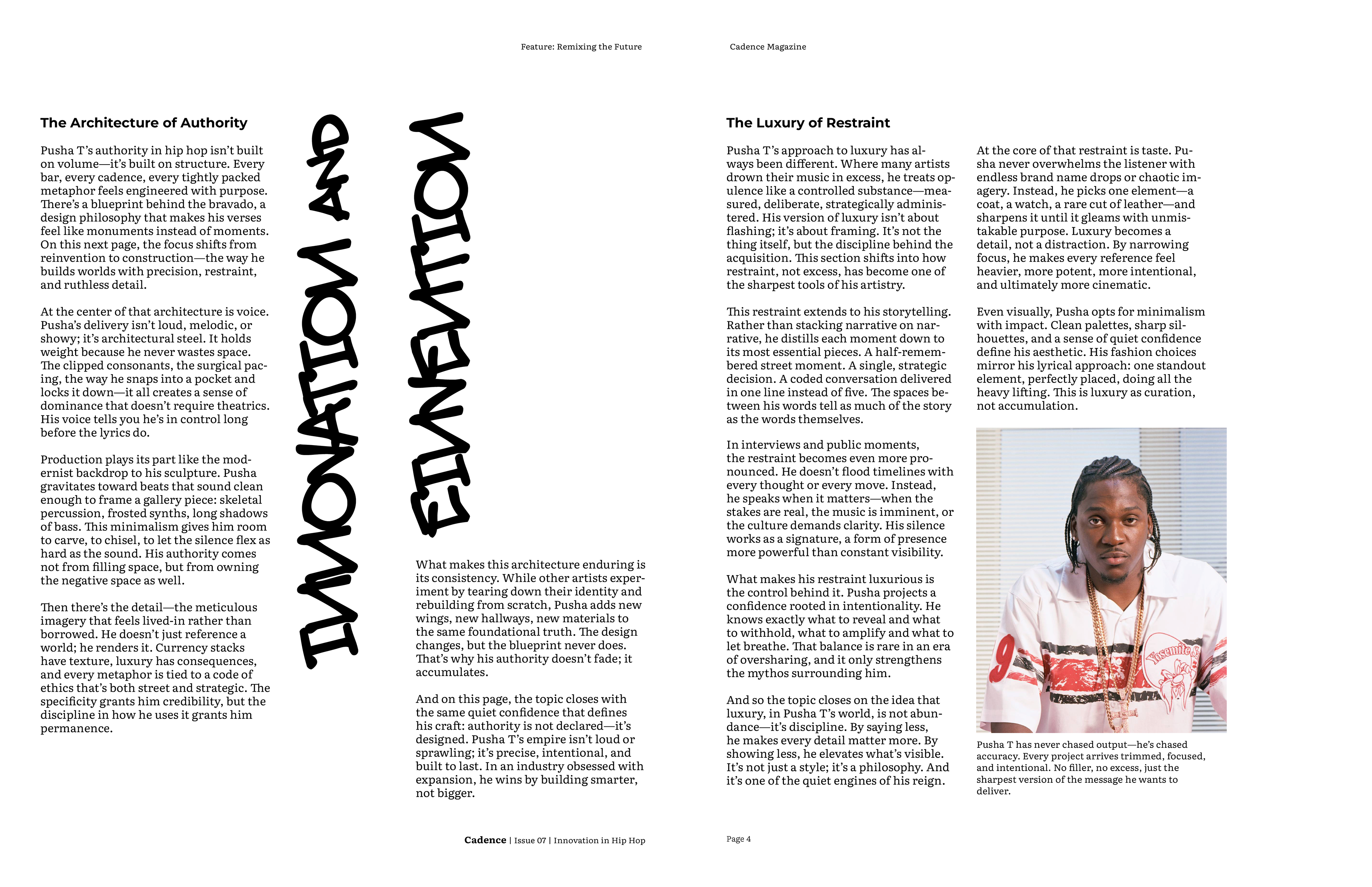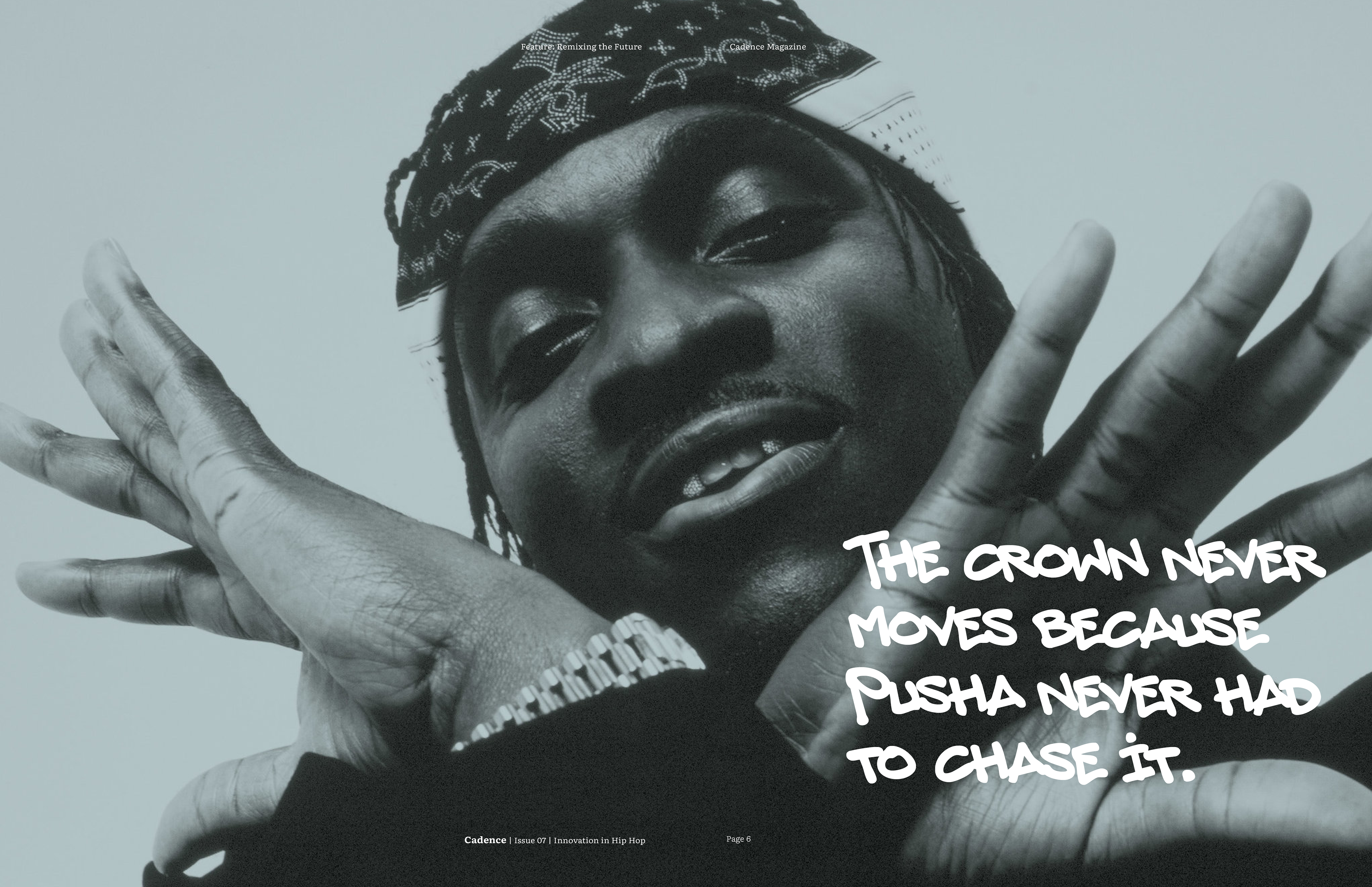 For the final magazine I decided to incorporate bold graffiti callouts, with the typeface choice inspired by the idea of ad-libs in hip hop. I used a 5 column grid system to replicate the open endedness in rap. The articles all start with a black and white image, however from there color may be incorporated, depending on what is necessary to convey the artist properly. I chose Literata as the typeface for body copy, since it is very legible, and Montserrat as a bold contrast for subheadings and decks.