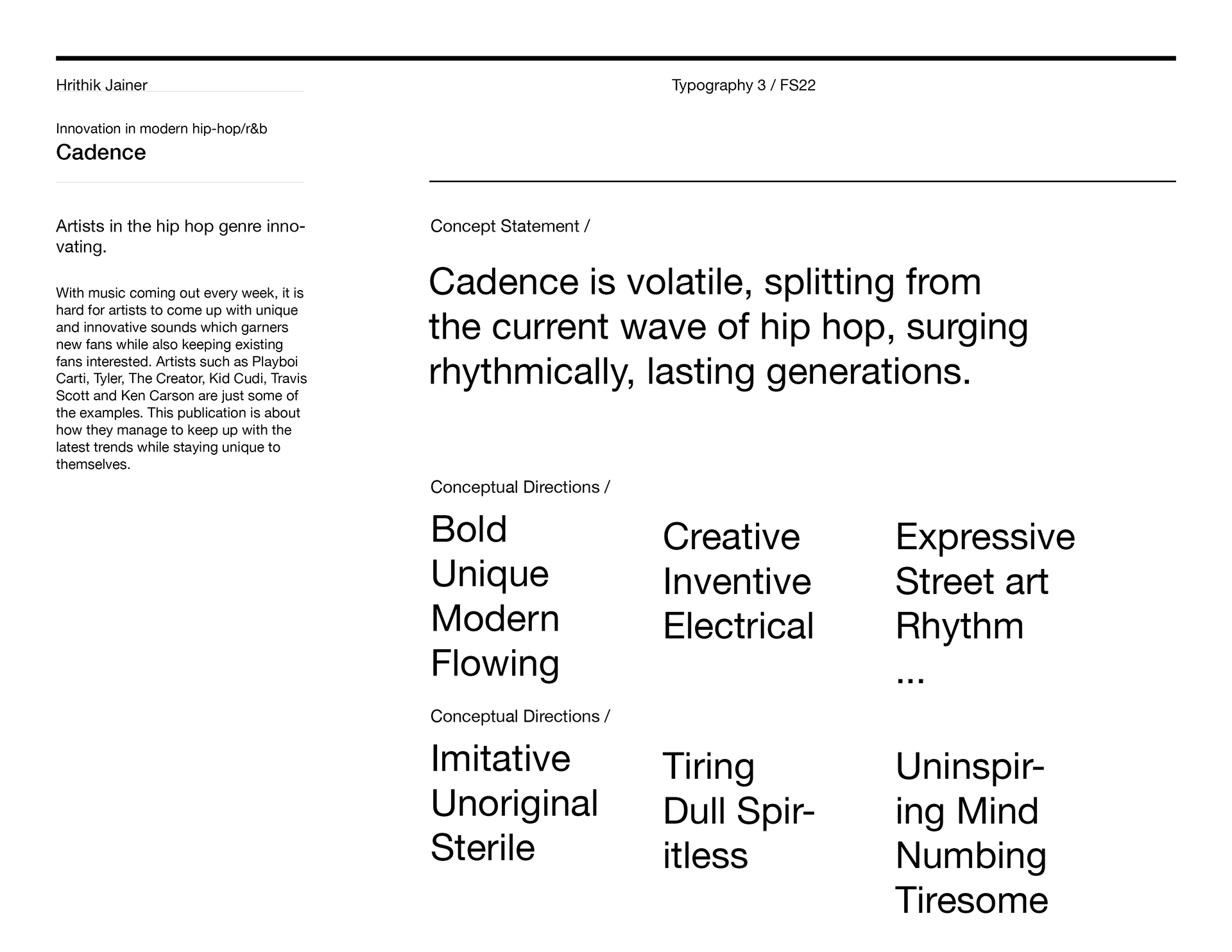 I settled on a script typeface, Ceviche One, since it was very expressive and bold, and made slight alterations to it. Since my concept statement referred to timelessness and the past, I incorporated my previously mentioned callbacks such as DMX, along with newer hip hop typography such as Playboi Carti in small details such as the exaggerated serifs.