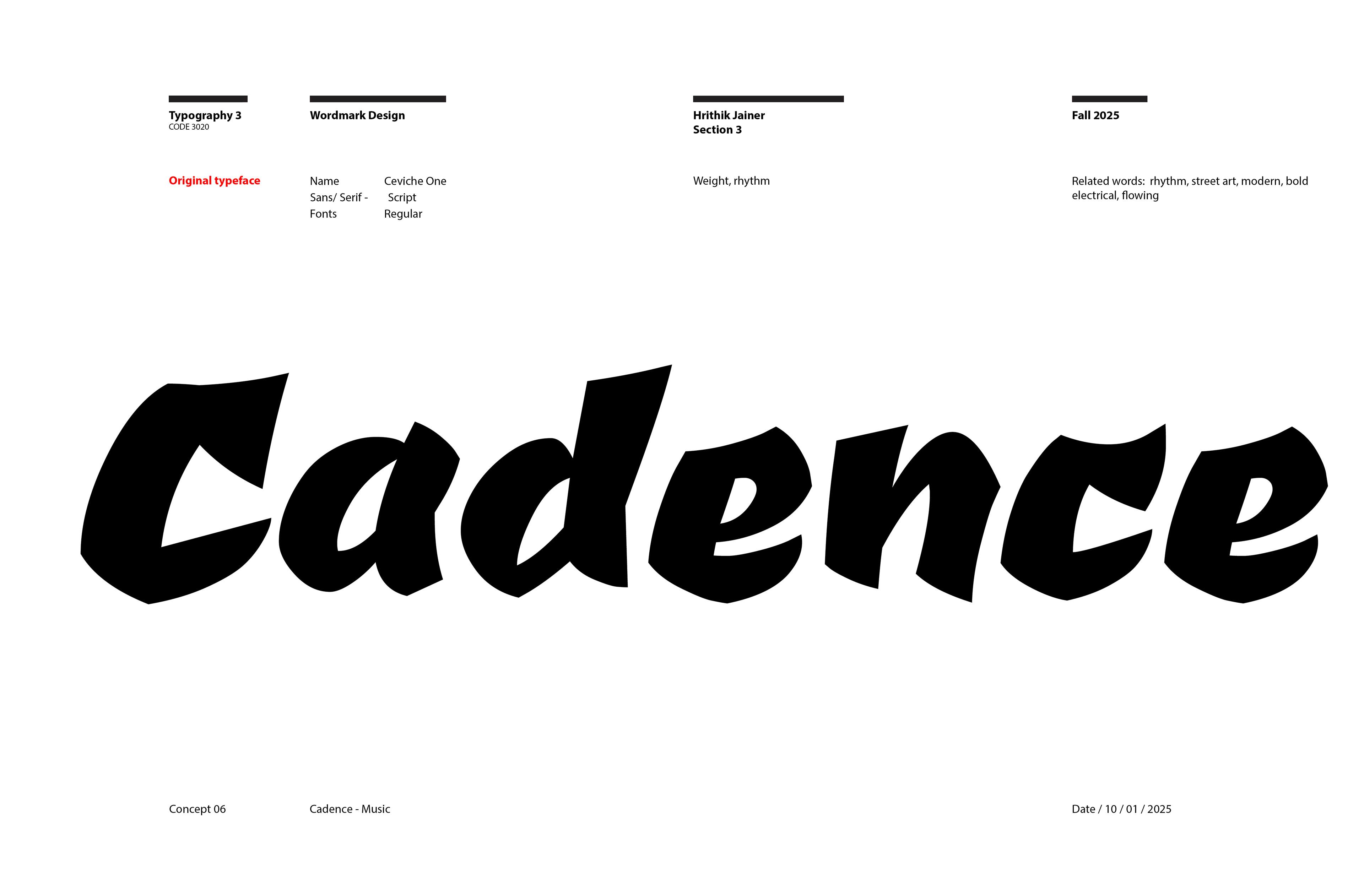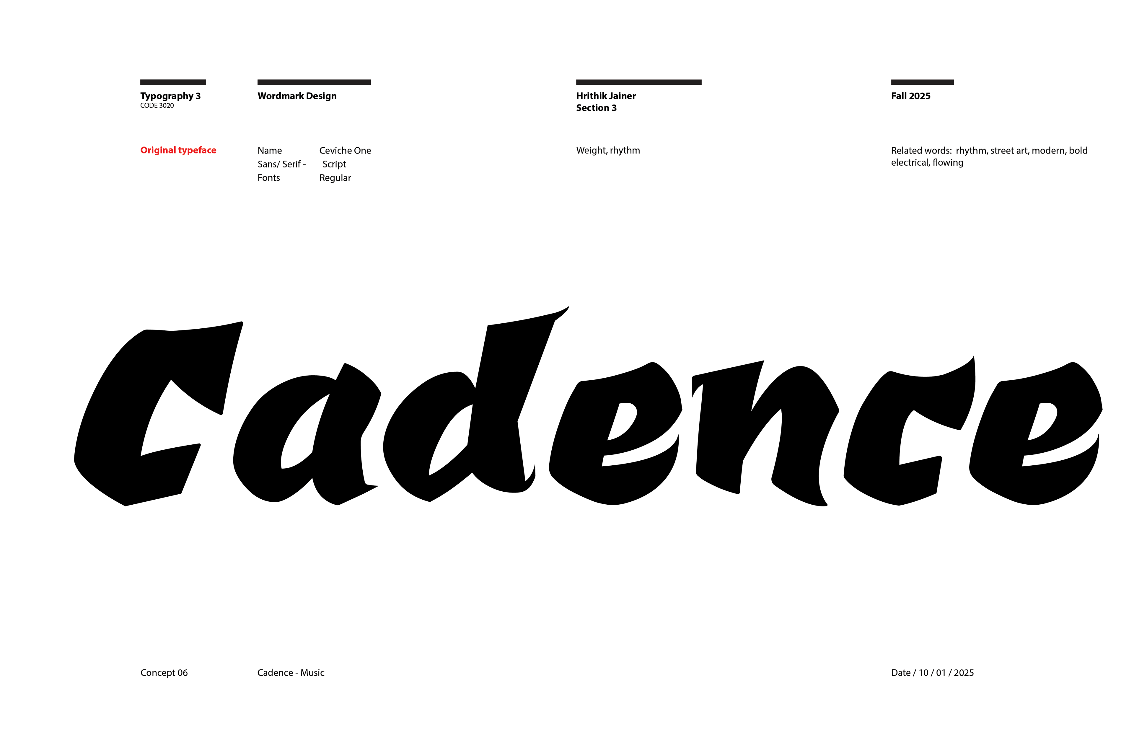 I began the project working on the Cadence wordmark. At first I was coming up with ideas based solely off of my concept statement, however after a few rounds of iteration not being as successful as I liked, I stepped back and researched hip hop word marks, and found inspiration in artists such as Lil Wayne, DMX, and Jay Z.